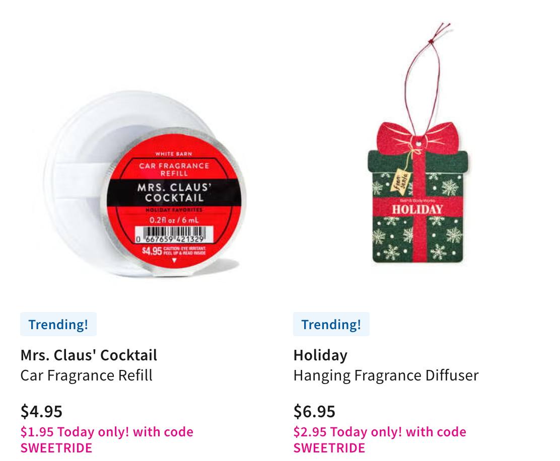 Just grabbed some stocking stuffers for the kids!!! Bath & Body Works Car Fragrances are only $1.95-2.95 with promo code SWEETRIDE, select in store pick up to avoid shipping!