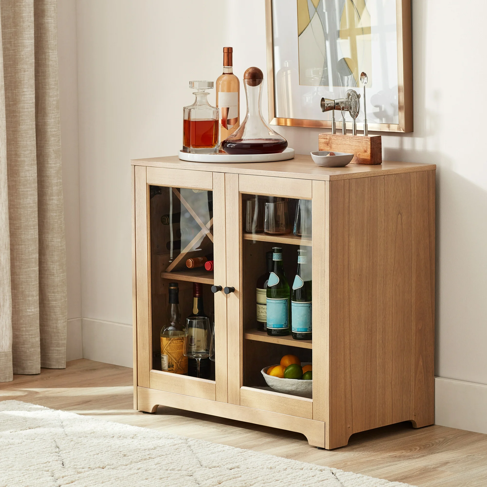 Better Homes & Gardens Aster Bar Cabinet, Natural Oak finish, by Dave & Jenny Marrs, $169.43 on sale for JUST $68.98 at Walmart!!