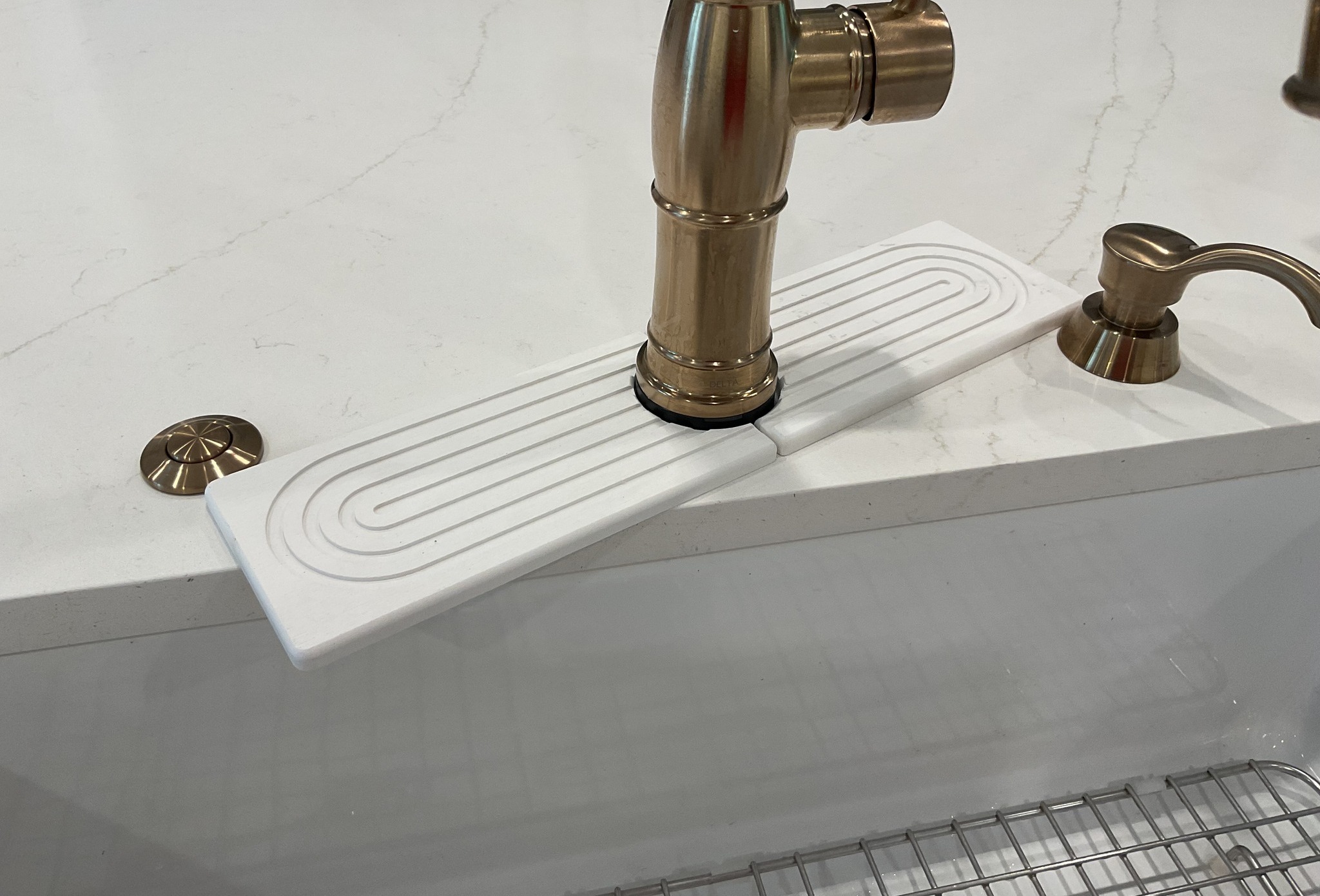 I was so bummed that this didn’t fit our sink!! Make sure you account for the things around it when you order! Such great quality though! Faucet Mat on sale for $16.99 but with promo code I8EK8KMN you score it for $8.49!