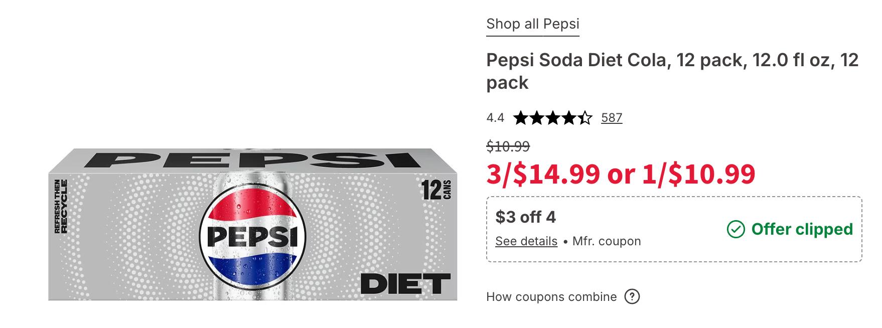 If you are a Pepsi girl like me, get over to Walgreens and grab FOUR 12 packs for only $16.99, that’s $4.25 each!! Add four to your cart from the link which will total $19.99 and then clip the $3 off 4 coupon and if you opt for in store pick up you avoid shipping! Remember soda prices may vary based on region!! We are in Jersey so it may be different for you! They have Pepsi and Mountain Dew on the link!