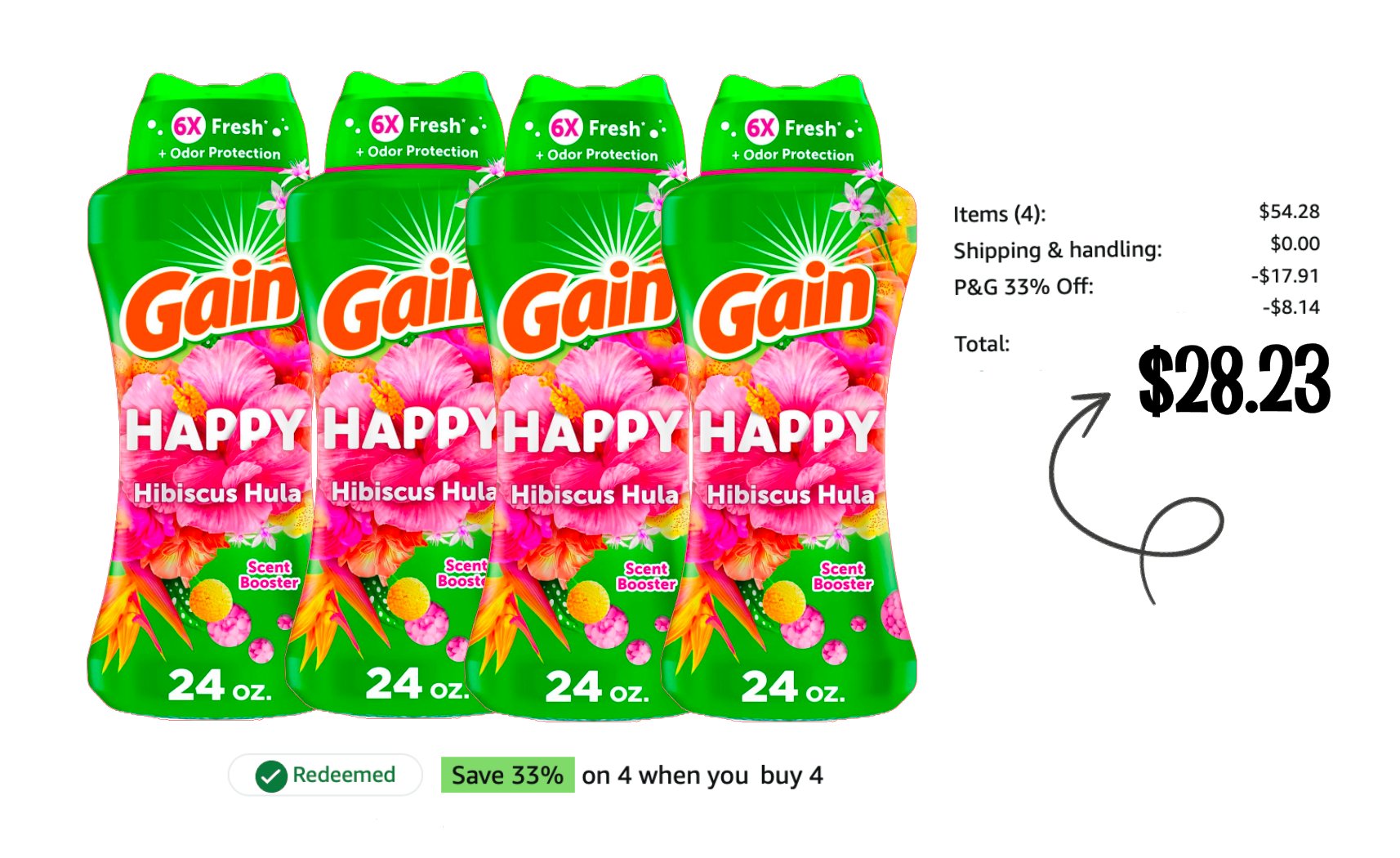 Add FOUR Gain In-Wash Laundry Scent Booster Beads, Happy, 24 oz to your cart at $13.57 each but then clip the 33% off coupon, opt for subscribe and save and you can score them for as low as $28.23, that’s $7.06 each!!