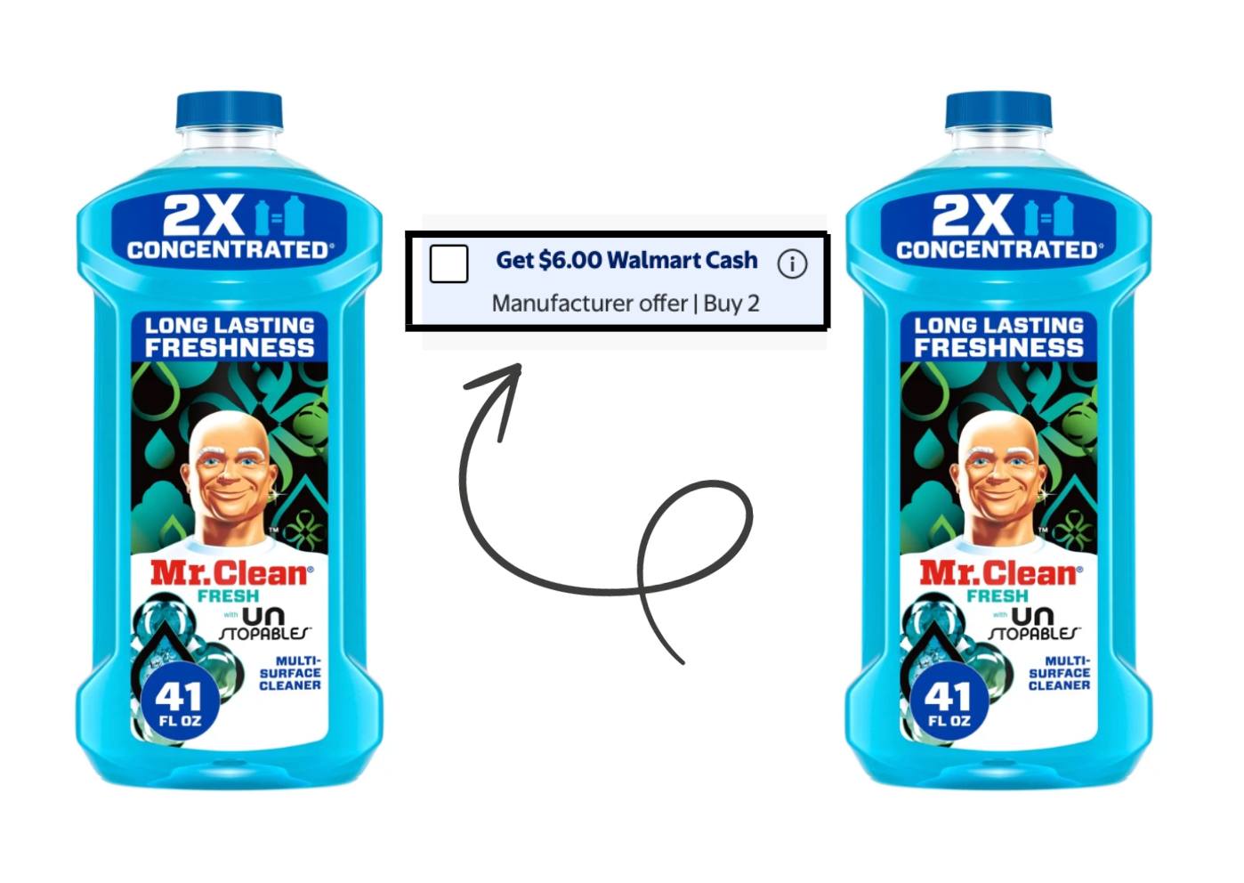 Mr. Clean 2X Concentrated Multi Surface is basically B1G1 FREE when you clip the Walmart $6 Cash Back coupon!! Each bottle is $5.94 but when you grab two and clip the cash back coupon you score $6 back so it’s like getting one bottle for free!