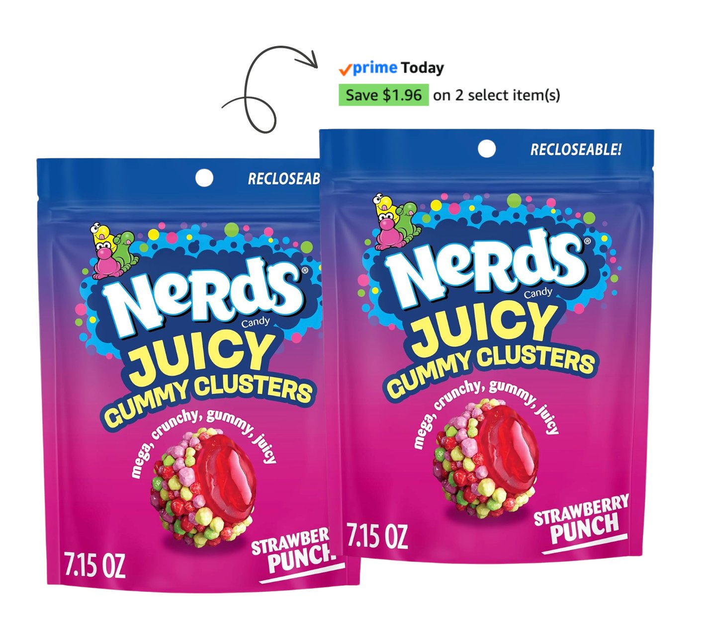 Add TWO NERDS Juicy Gummy Clusters, 7.15 oz Bags and $1.96 will come off automatically at checkout!! So you score them for both for $5.98, that’s $2.99 a bag! Even less if you opt for subscribe and save!