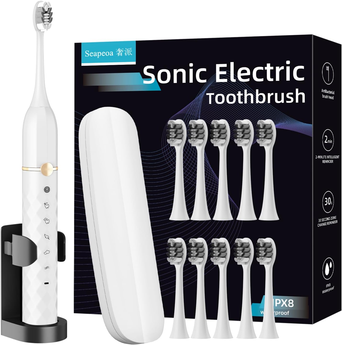 Seapeoa Rechargeable Electric Toothbrush with 10 Brush Heads and Travel case, promo code RP45H394 should auto apply, dropping as low as $9.49 in a few color options!
