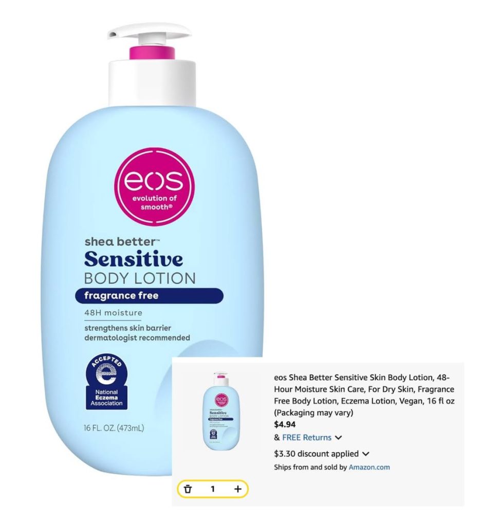 eos Shea Better Sensitive Skin Body Lotion 16 oz has a clippable 25% off coupon when you opt for subscribe and save!!! That drops the price to as low as $4.94!!