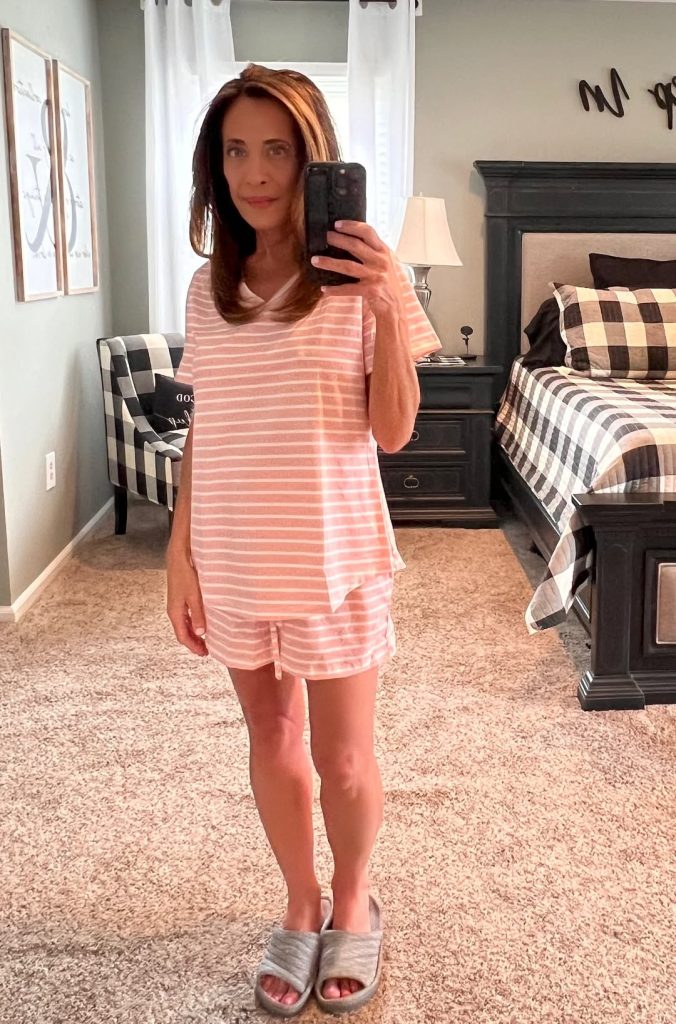 Ekouaer Pajama Set on sale for $24.99 but with promo code 8W3BE945 you score it for $12.99! Works on all options! I’m wearing the small in the pink stripes!