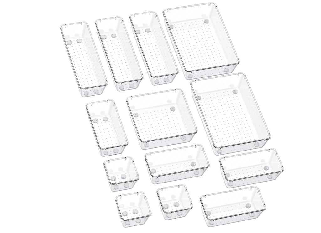 13-Piece Drawer Organizers with Non-Slip Silicone Pads, 5-Size Desk Bathroom Drawer Organizer for Makeup, Jewelry, Utensils in Bedroom Dresser, Office and Kitchen, Clear, Were $21.99 down to $15.29 Limited Time Deal.