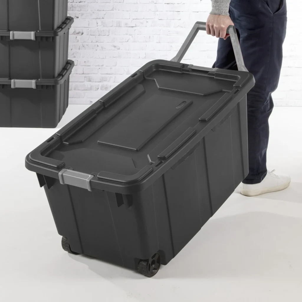 Sterilite 40 Gallon Wheeled Industrial Tote, Rugged Plastic Storage Bin, Latch Lid, Dark Gray, on sale now for ONLY $19.97!!