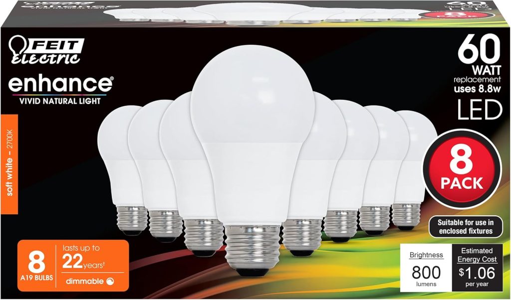 Feit Electric A19 LED Light Bulbs, 60W Equivalent, Dimmable, E26 Standard Base, 90 CRI, 800 Lumens, 2700K Soft White, 8 Pack, on sale now for just $12.99!!