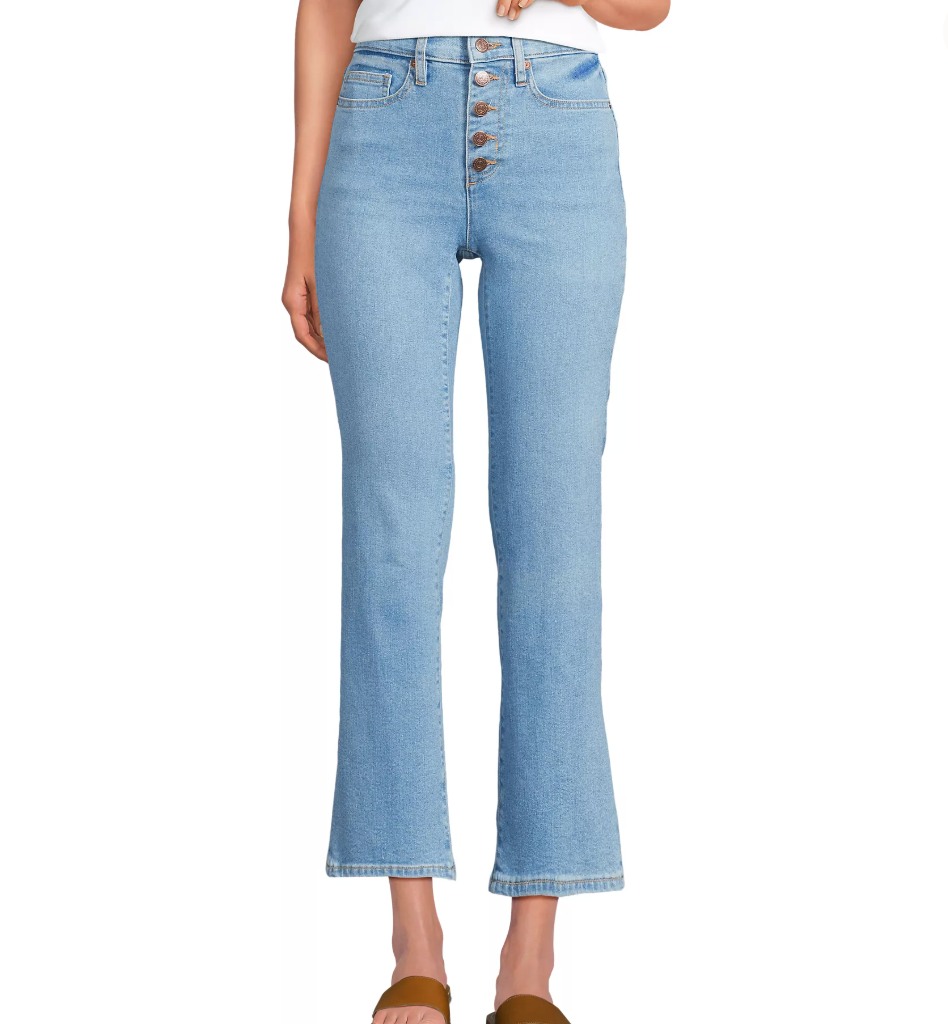Lands’ End Women’s Recover High Rise Button Front Kick Flare Crop Jeans on sale for $15.98-26.38 when you use promo code SUNDRESS, the Mellow Indigo color is the best priced!