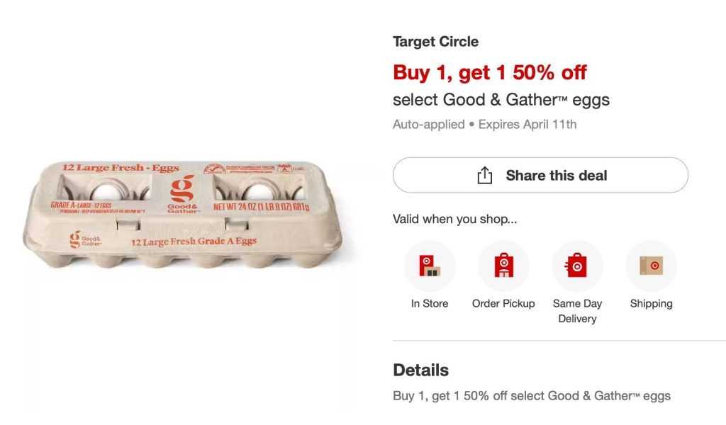 Perfect for last minute egg dying!!! Target Good & Gather Eggs are buy 1, get 1 50% off!! Select in store pick up and have them in two hours!