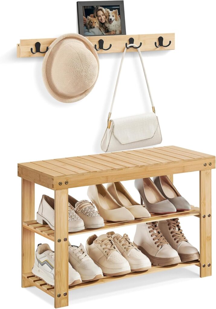 SONGMICS Coat Rack Shoe Bench Set, Light Bamboo color option, normally $59.99 but now score for $26.99!!!