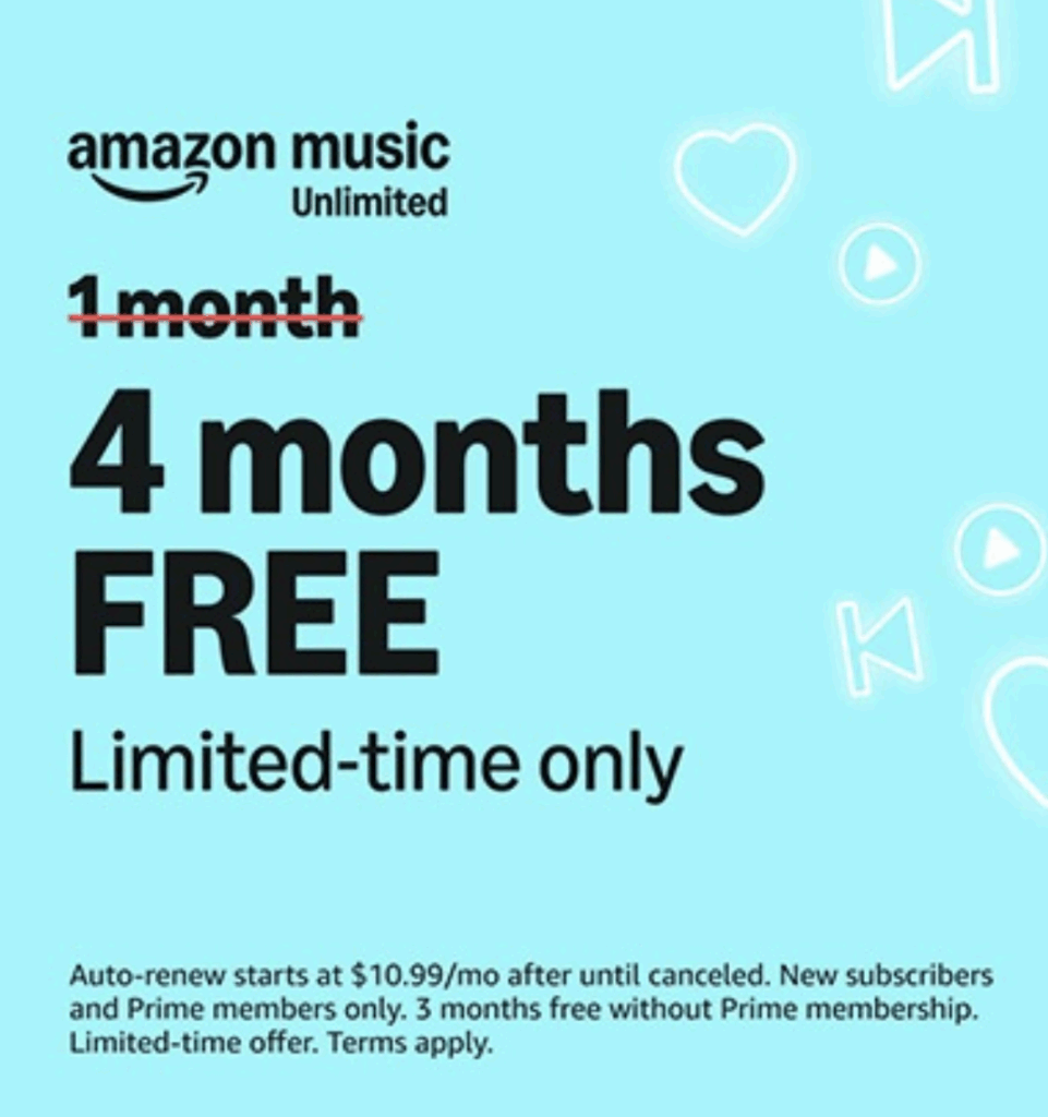 Amazon Music Unlimited subscribers their first FOUR months for FREE! Read More »