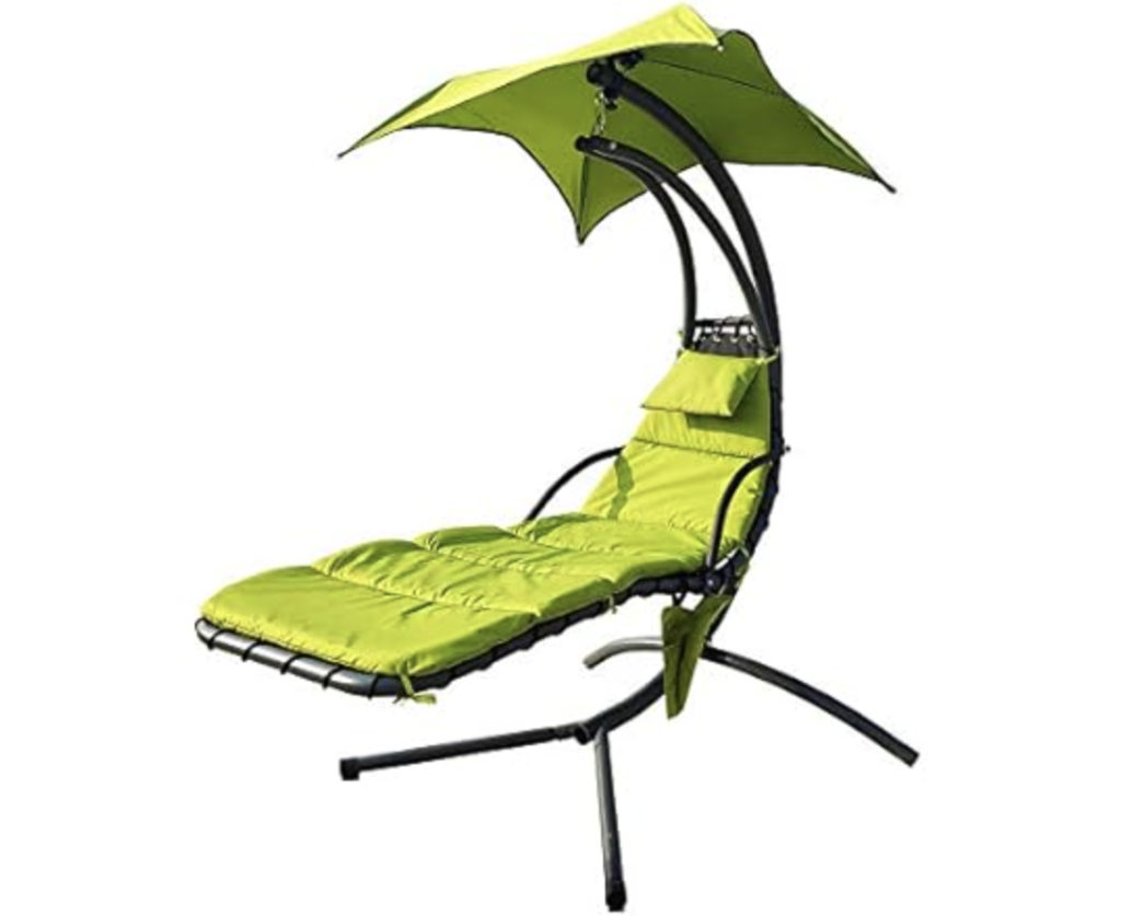 BalanceFrom Hanging Curved Chaise Lounge Chair Swing with Cushion, Pillow, Canopy, Stand and Storage Pouch, $199.99 but this color option is on clearance for $79.99!! Log in with Prime for free shipping!