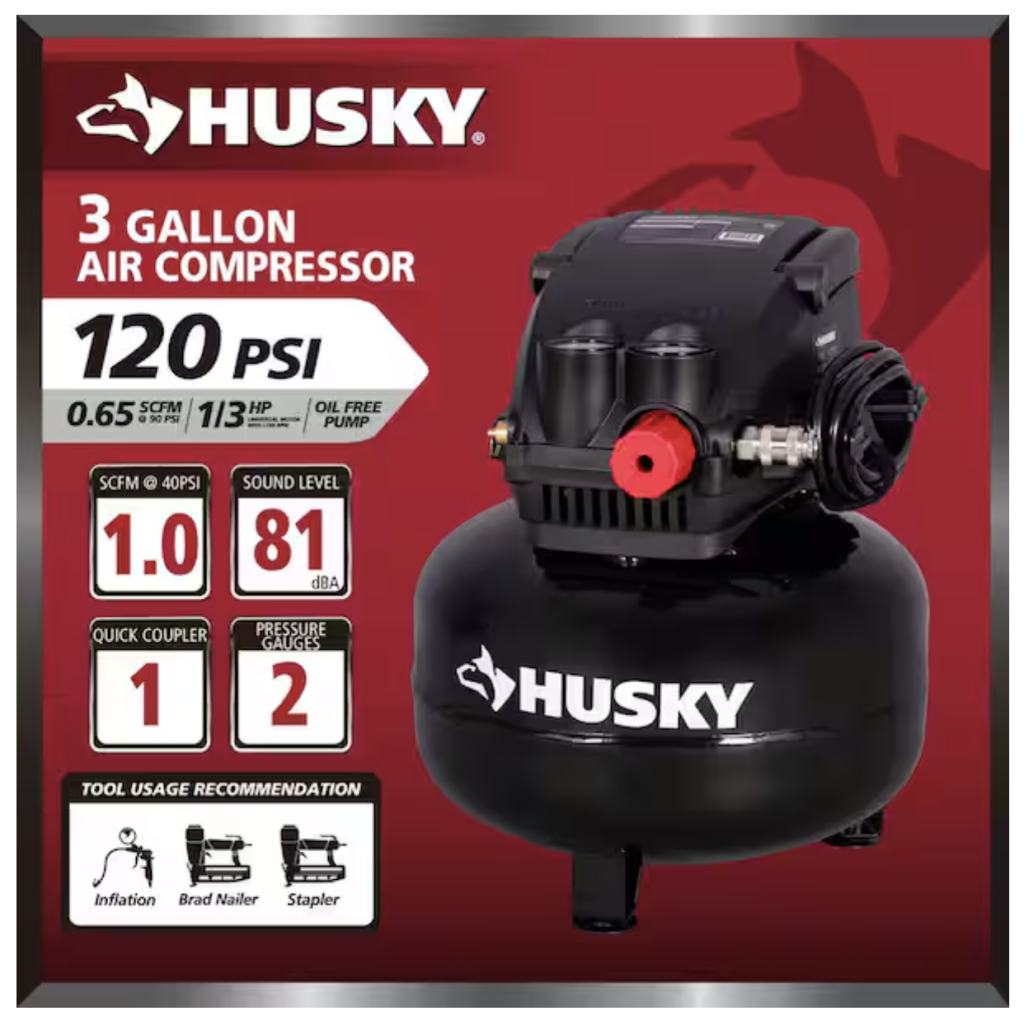 Husky 3 Gal. 120 PSI Portable Electric Oil-Free Light Duty Pancake Air Compressor, retails for $67.97 but The Home Depot now has it down to $37.31!!!